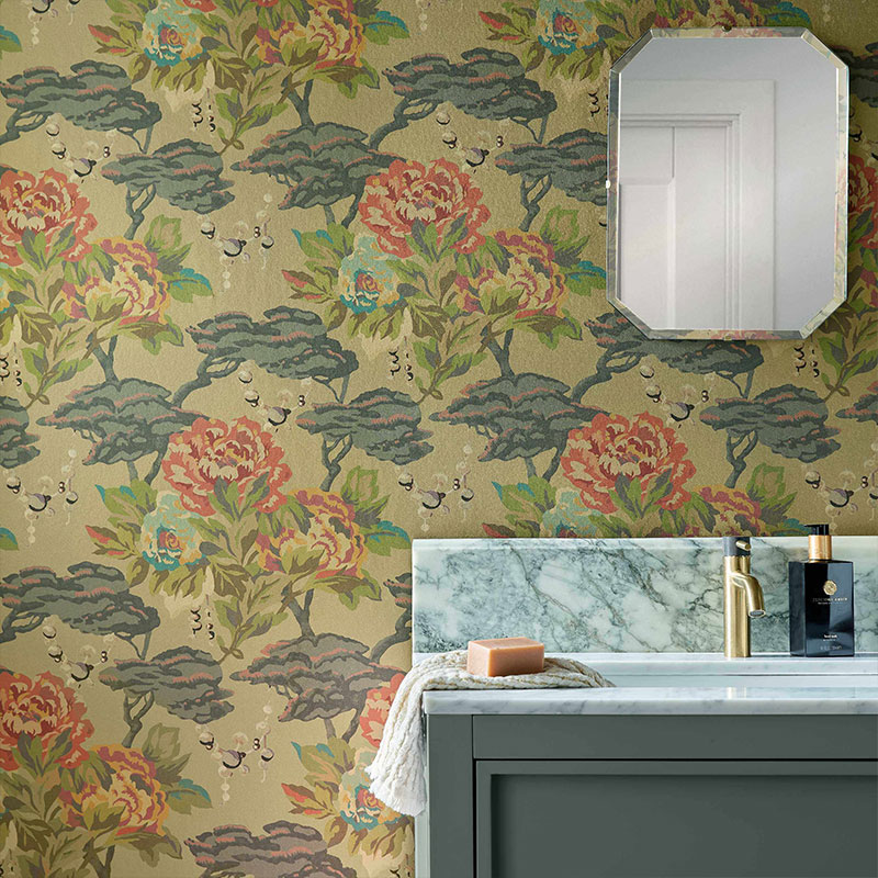 Based on a fabric from the V&A archive dating back to 1918, Paeonia depicts large peony heads, built up with layers of luscious colour. Featuring ornate motifs and exotic blooms, these fabrics recalled hand-painted Chinese wall panels originally seen in 18th-century European decoration. The wallpaper retains most of the original textile’s detail and has been skilfully remastered giving space for the stunning blooms to flourish and transform home interior spaces. In warm sand the neutral background is adorned with flowers in soft tones of coral, ochre and teal.